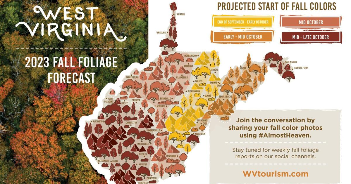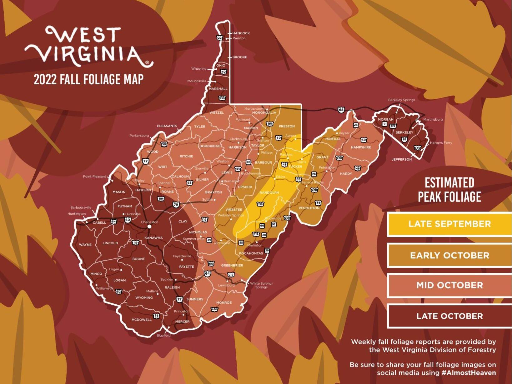 West Virginia Fall Foliage Map 2024 – According to the map, the Blue Ridge Mountains in western Virginia and parts of northern Virginia saw minimal leaf changes on the week of Sept. 18. The fall foliage map on October 13 shows that . 4—BLUEFIELD — Southern West throughout the foliage season.” The public will get regular updates about the best places for viewing fall foliage. A fall foliage map is available on the .